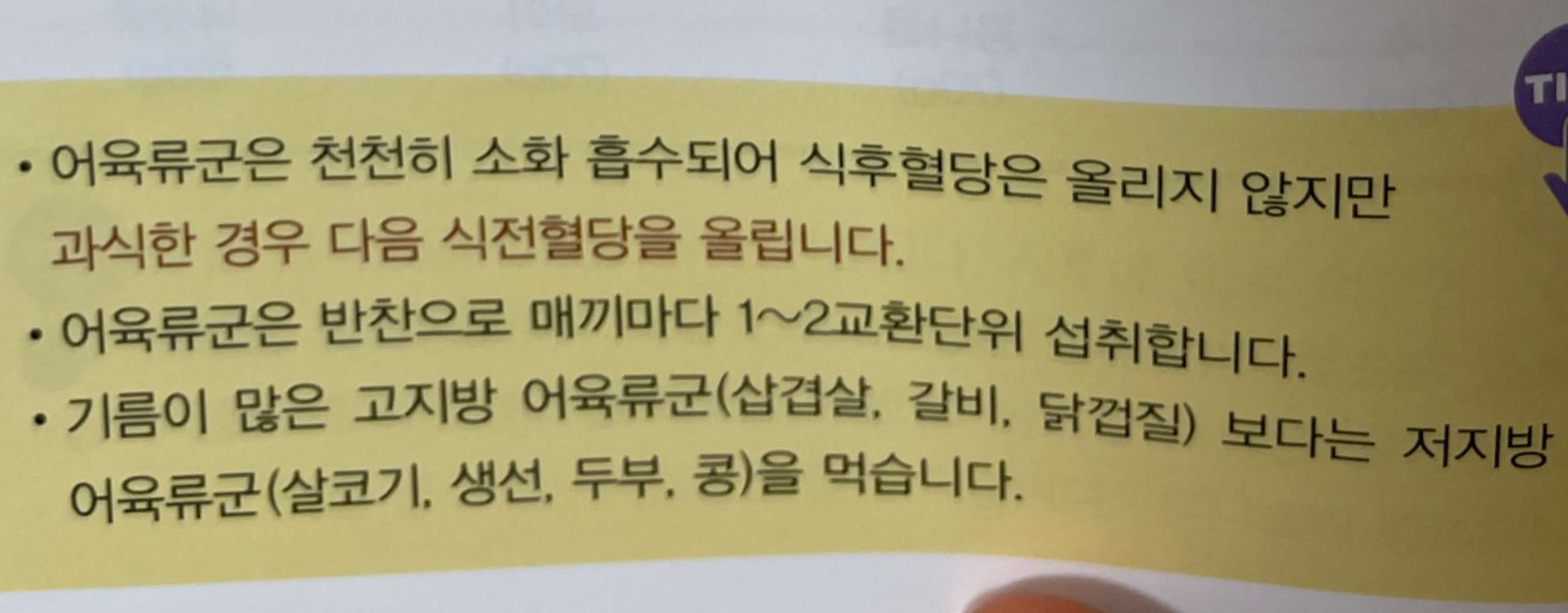 어육류군( 단백질 ) 은 천천히 소화 흡수되어 식후혈당은 올리지 않지만 과식한 경우 다음 식전혈당을 올립니다.